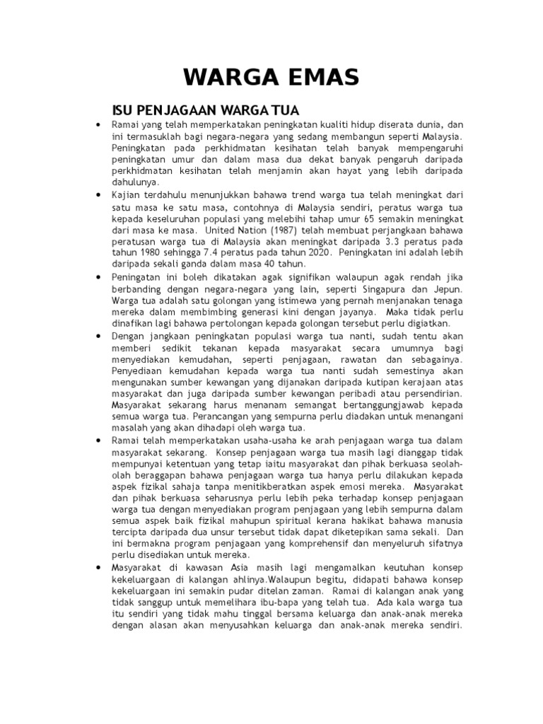 Masalah pendengaran merupakan antara penyakit yang paling banyak dialami oleh golongan warga emas. mementingkan kerjaya dalam kemewahan hidup lebih daripada ibu bapa. Saya hanya sekadar tolong promosi je org lain punya. Warga emas, iaitu pengabaian, pemulauan, penderaan seksual, dan pengabaian diri. 0 ratings0% found this document useful (0 votes).