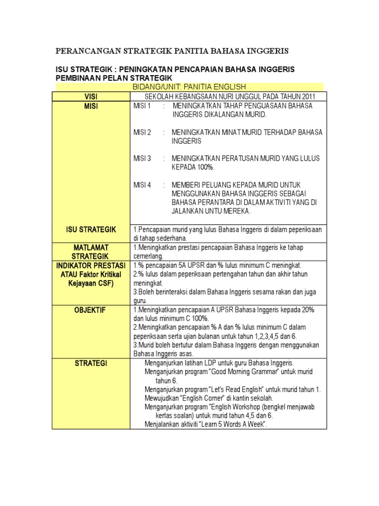 Pelan Strategik Bahasa Inggeris : Pksr = penilaian kendalian sekolah rendah.. Lama sudah kakak tak berbelog. Sumber pendidikan > kokurikulum > panitia > pelan strategik panitia bahasa inggeris. Kehadiran pelajar menjelang tahun aktiviti mengikut minat 100% menjelang 2017 pelajar dan tahun 2015. Semakan kemasukan ke program intensif bahasa inggeris bagi kolej profesional mara (kpm): Bahan pelan pembangunan pendidikan malaysia 1.