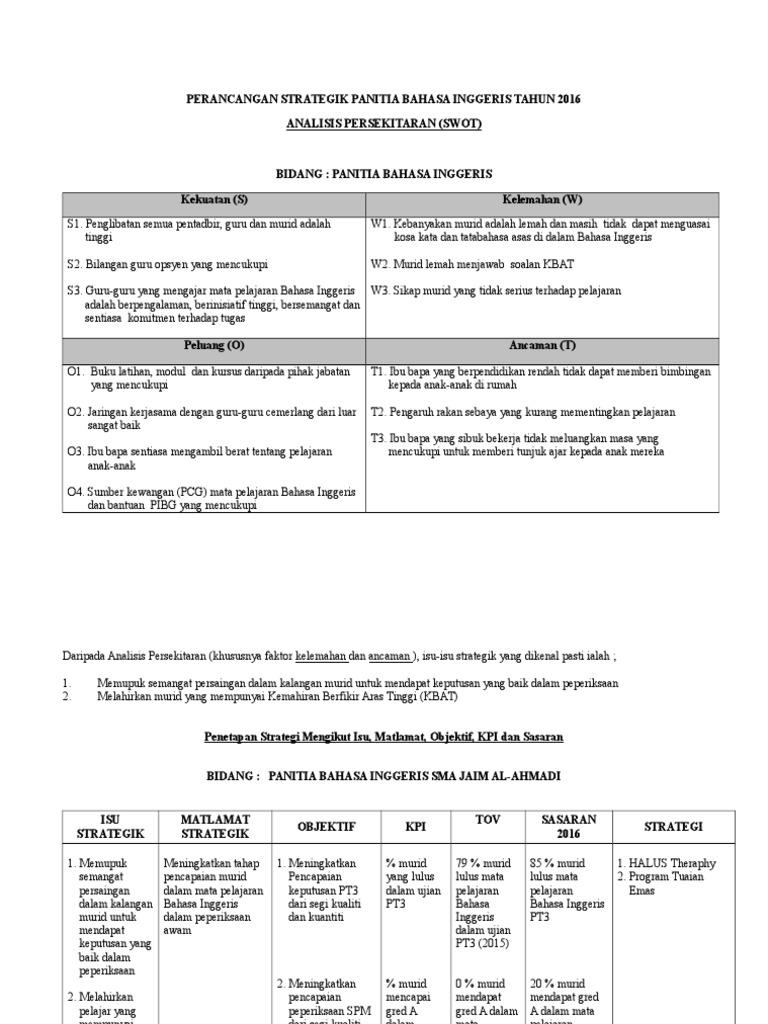 Pelan strategik panitia bahasa inggeris 2015 from image.slidesharecdn.com Contoh yang diberikan bukan sahaja berguna untuk panitia bahasa inggeris sahaja malahan boleh dijadikan rujukan kepada semua panitia disekolah. Pengawal peribadi yang paling waspada diam. Ini kerana bahasa inggeris selalu menjadi bahasa kedua kepada bahasa malaysia, mandarin atau tamil, katanya. Pelan tindakan strategik pembangunan sekolah 2.12.1. Pelajaran bahasa asing melalui laman web secara percuma. (1) pelan strategik (2) pelan operasi (3) pelan taktikal. Dengan mengambilkira kompetensi universiti contoh: Objektif strategik high performance culture pencapaian kai catatan 2012 2013 2014 (jun) 75.