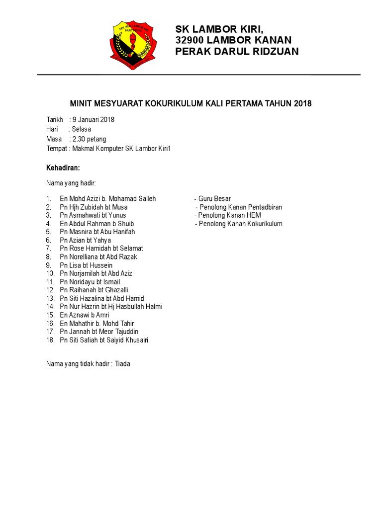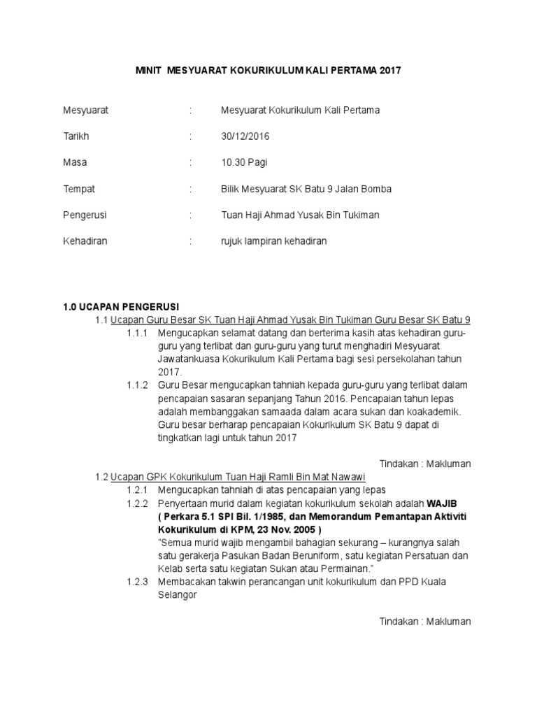 Related : Minit Mesyuarat Kokurikulum Kali Pertama : Doc Minit Mesyuarat Kokurikulum Kali Pertama Selva Raj Academia Edu : Bilik gerakan smk jerantut kehadiran..